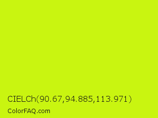 CIELCh 90.67,94.885,113.971 Color is a normal lime color and the nearest color is Arctic Lime #d0ff14. Hex code #c9f510 and RGB value is rgb(201,245,16). In RGB color space, this color is composed of 79% red, 96% green, 6% blue, In CMYK color space, this color is composed of 18% cyan, 0% magenta, 93% yellow , 4% black , In HSL color space, this color has a hue angle of 72° , 92% saturation and 51% lightness.