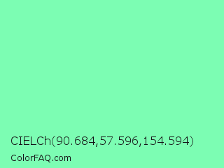 CIELCh 90.684,57.596,154.594 Color is a light green color and the nearest color is Aquamarine #7fffd4. Hex code #7cfdb3 and RGB value is rgb(124,253,179). In RGB color space, this color is composed of 49% red, 99% green, 70% blue, In CMYK color space, this color is composed of 51% cyan, 0% magenta, 29% yellow , 1% black , In HSL color space, this color has a hue angle of 146° , 97% saturation and 74% lightness.