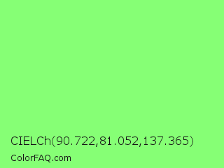 CIELCh 90.722,81.052,137.365 Color is a light green color and the nearest color is Light Green #90ee90. Hex code #86ff75 and RGB value is rgb(134,255,117). In RGB color space, this color is composed of 53% red, 100% green, 46% blue, In CMYK color space, this color is composed of 47% cyan, 0% magenta, 54% yellow , 0% black , In HSL color space, this color has a hue angle of 113° , 100% saturation and 73% lightness.