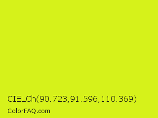 CIELCh 90.723,91.596,110.369 Color is a normal yellow color and the nearest color is Arctic Lime #d0ff14. Hex code #d6f21a and RGB value is rgb(214,242,26). In RGB color space, this color is composed of 84% red, 95% green, 10% blue, In CMYK color space, this color is composed of 12% cyan, 0% magenta, 89% yellow , 5% black , In HSL color space, this color has a hue angle of 68° , 89% saturation and 53% lightness.