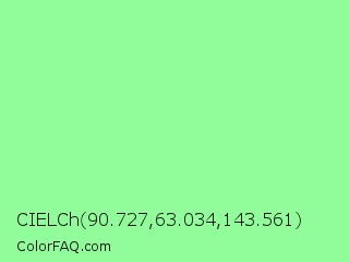 CIELCh 90.727,63.034,143.561 Color is a light green color and the nearest color is Pale Green #98fb98. Hex code #90fc9a and RGB value is rgb(144,252,154). In RGB color space, this color is composed of 56% red, 99% green, 60% blue, In CMYK color space, this color is composed of 43% cyan, 0% magenta, 39% yellow , 1% black , In HSL color space, this color has a hue angle of 126° , 95% saturation and 78% lightness.