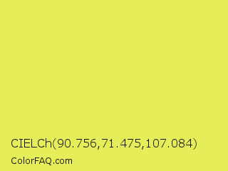 CIELCh 90.756,71.475,107.084 Color is a light yellow color and the nearest color is Maximum Green Yellow #d9e650. Hex code #e5ed59 and RGB value is rgb(229,237,89). In RGB color space, this color is composed of 90% red, 93% green, 35% blue, In CMYK color space, this color is composed of 3% cyan, 0% magenta, 62% yellow , 7% black , In HSL color space, this color has a hue angle of 63° , 80% saturation and 64% lightness.