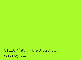 CIELCh 90.778,98,123.13 Color is a normal green color and the nearest color is Green Yellow #adff2f. Hex code #a7fc29 and RGB value is rgb(167,252,41). In RGB color space, this color is composed of 65% red, 99% green, 16% blue, In CMYK color space, this color is composed of 34% cyan, 0% magenta, 84% yellow , 1% black , In HSL color space, this color has a hue angle of 84° , 97% saturation and 57% lightness.