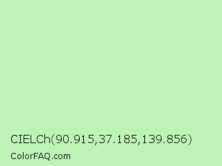 CIELCh 90.915,37.185,139.856 Color is a very light green color and the nearest color is Madang #b7f0be. Hex code #bdf3b6 and RGB value is rgb(189,243,182). In RGB color space, this color is composed of 74% red, 95% green, 71% blue, In CMYK color space, this color is composed of 22% cyan, 0% magenta, 25% yellow , 5% black , In HSL color space, this color has a hue angle of 113° , 72% saturation and 83% lightness.