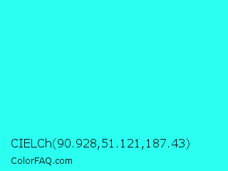 CIELCh 90.928,51.121,187.43 Color is a normal cyan color and the nearest color is Loeen #15f2fd. Hex code #2bfff0 and RGB value is rgb(43,255,240). In RGB color space, this color is composed of 17% red, 100% green, 94% blue, In CMYK color space, this color is composed of 83% cyan, 0% magenta, 6% yellow , 0% black , In HSL color space, this color has a hue angle of 176° , 100% saturation and 58% lightness.