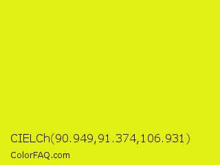 CIELCh 90.949,91.374,106.931 Color is a normal yellow color and the nearest color is Piss Yellow #e1e115. Hex code #e1f012 and RGB value is rgb(225,240,18). In RGB color space, this color is composed of 88% red, 94% green, 7% blue, In CMYK color space, this color is composed of 6% cyan, 0% magenta, 93% yellow , 6% black , In HSL color space, this color has a hue angle of 64° , 88% saturation and 51% lightness.
