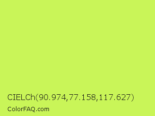 CIELCh 90.974,77.158,117.627 Color is a light lime color and the nearest color is Maximum Green Yellow #d9e650. Hex code #c9f558 and RGB value is rgb(201,245,88). In RGB color space, this color is composed of 79% red, 96% green, 35% blue, In CMYK color space, this color is composed of 18% cyan, 0% magenta, 64% yellow , 4% black , In HSL color space, this color has a hue angle of 77° , 89% saturation and 65% lightness.