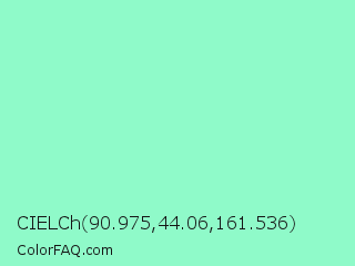 CIELCh 90.975,44.06,161.536 Color is a light green color and the nearest color is Aquamarine #7fffd4. Hex code #8ffac9 and RGB value is rgb(143,250,201). In RGB color space, this color is composed of 56% red, 98% green, 79% blue, In CMYK color space, this color is composed of 43% cyan, 0% magenta, 20% yellow , 2% black , In HSL color space, this color has a hue angle of 153° , 91% saturation and 77% lightness.