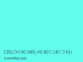 CIELCh 90.985,43.807,187.743 Color is a light cyan color and the nearest color is Electric Blue #7df9ff. Hex code #62fcef and RGB value is rgb(98,252,239). In RGB color space, this color is composed of 38% red, 99% green, 94% blue, In CMYK color space, this color is composed of 61% cyan, 0% magenta, 5% yellow , 1% black , In HSL color space, this color has a hue angle of 175° , 96% saturation and 69% lightness.