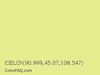 CIELCh 90.999,45.07,108.547 Color is a light yellow color and the nearest color is Primrose #edea99. Hex code #e7eb92 and RGB value is rgb(231,235,146). In RGB color space, this color is composed of 91% red, 92% green, 57% blue, In CMYK color space, this color is composed of 2% cyan, 0% magenta, 38% yellow , 8% black , In HSL color space, this color has a hue angle of 63° , 69% saturation and 75% lightness.