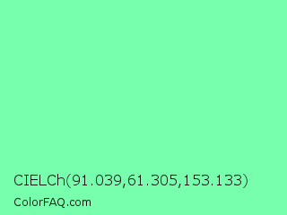 CIELCh 91.039,61.305,153.133 Color is a light green color and the nearest color is Aquamarine #7fffd4. Hex code #78ffae and RGB value is rgb(120,255,174). In RGB color space, this color is composed of 47% red, 100% green, 68% blue, In CMYK color space, this color is composed of 53% cyan, 0% magenta, 32% yellow , 0% black , In HSL color space, this color has a hue angle of 144° , 100% saturation and 74% lightness.