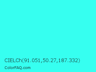 CIELCh 91.051,50.27,187.332 Color is a light cyan color and the nearest color is Loeen #15f2fd. Hex code #36fff0 and RGB value is rgb(54,255,240). In RGB color space, this color is composed of 21% red, 100% green, 94% blue, In CMYK color space, this color is composed of 79% cyan, 0% magenta, 6% yellow , 0% black , In HSL color space, this color has a hue angle of 176° , 100% saturation and 61% lightness.