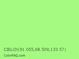 CIELCh 91.055,68.509,133.57 Color is a light green color and the nearest color is Pale Green #98fb98. Hex code #a5fb82 and RGB value is rgb(165,251,130). In RGB color space, this color is composed of 65% red, 98% green, 51% blue, In CMYK color space, this color is composed of 34% cyan, 0% magenta, 48% yellow , 2% black , In HSL color space, this color has a hue angle of 103° , 94% saturation and 75% lightness.