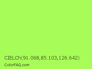 CIELCh 91.068,85.103,126.642 Color is a light green color and the nearest color is Inchworm #b2ec5d. Hex code #a8fc57 and RGB value is rgb(168,252,87). In RGB color space, this color is composed of 66% red, 99% green, 34% blue, In CMYK color space, this color is composed of 33% cyan, 0% magenta, 65% yellow , 1% black , In HSL color space, this color has a hue angle of 91° , 96% saturation and 66% lightness.