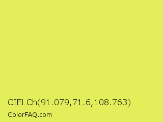 CIELCh 91.079,71.6,108.763 Color is a light yellow color and the nearest color is Maximum Green Yellow #d9e650. Hex code #e2ef5b and RGB value is rgb(226,239,91). In RGB color space, this color is composed of 89% red, 94% green, 36% blue, In CMYK color space, this color is composed of 5% cyan, 0% magenta, 62% yellow , 6% black , In HSL color space, this color has a hue angle of 65° , 82% saturation and 65% lightness.