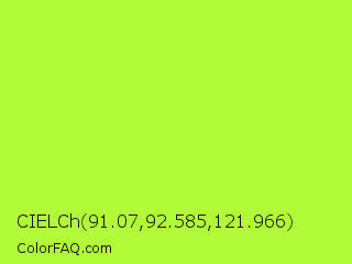 CIELCh 91.07,92.585,121.966 Color is a normal green color and the nearest color is Green Yellow #adff2f. Hex code #b1fb39 and RGB value is rgb(177,251,57). In RGB color space, this color is composed of 69% red, 98% green, 22% blue, In CMYK color space, this color is composed of 29% cyan, 0% magenta, 77% yellow , 2% black , In HSL color space, this color has a hue angle of 83° , 96% saturation and 60% lightness.