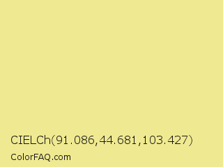 CIELCh 91.086,44.681,103.427 Color is a light yellow color and the nearest color is Khaki #f0e68c. Hex code #efe991 and RGB value is rgb(239,233,145). In RGB color space, this color is composed of 94% red, 91% green, 57% blue, In CMYK color space, this color is composed of 0% cyan, 3% magenta, 39% yellow , 6% black , In HSL color space, this color has a hue angle of 56° , 75% saturation and 75% lightness.