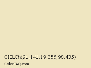 CIELCh 91.141,19.356,98.435 Color is a very light yellow color and the nearest color is Fall Green #ecebbd. Hex code #efe6c1 and RGB value is rgb(239,230,193). In RGB color space, this color is composed of 94% red, 90% green, 76% blue, In CMYK color space, this color is composed of 0% cyan, 4% magenta, 19% yellow , 6% black , In HSL color space, this color has a hue angle of 48° , 59% saturation and 85% lightness.
