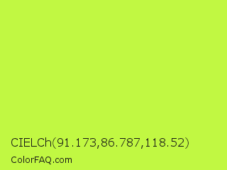 CIELCh 91.173,86.787,118.52 Color is a light lime color and the nearest color is Green Yellow #adff2f. Hex code #c1f842 and RGB value is rgb(193,248,66). In RGB color space, this color is composed of 76% red, 97% green, 26% blue, In CMYK color space, this color is composed of 22% cyan, 0% magenta, 73% yellow , 3% black , In HSL color space, this color has a hue angle of 78° , 93% saturation and 62% lightness.