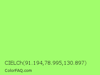CIELCh 91.194,78.995,130.897 Color is a light green color and the nearest color is Inchworm #b2ec5d. Hex code #a1fd6c and RGB value is rgb(161,253,108). In RGB color space, this color is composed of 63% red, 99% green, 42% blue, In CMYK color space, this color is composed of 36% cyan, 0% magenta, 57% yellow , 1% black , In HSL color space, this color has a hue angle of 98° , 97% saturation and 71% lightness.