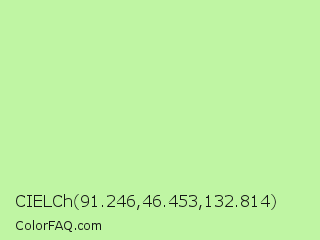 CIELCh 91.246,46.453,132.814 Color is a light green color and the nearest color is Reef #c9ffa2. Hex code #bff5a3 and RGB value is rgb(191,245,163). In RGB color space, this color is composed of 75% red, 96% green, 64% blue, In CMYK color space, this color is composed of 22% cyan, 0% magenta, 33% yellow , 4% black , In HSL color space, this color has a hue angle of 100° , 80% saturation and 80% lightness.