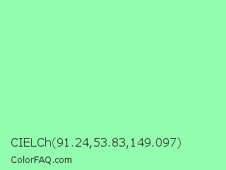 CIELCh 91.24,53.83,149.097 Color is a light green color and the nearest color is Teal Deer #99e6b3. Hex code #94fcaf and RGB value is rgb(148,252,175). In RGB color space, this color is composed of 58% red, 99% green, 69% blue, In CMYK color space, this color is composed of 41% cyan, 0% magenta, 31% yellow , 1% black , In HSL color space, this color has a hue angle of 136° , 95% saturation and 78% lightness.