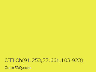 CIELCh 91.253,77.661,103.923 Color is a light yellow color and the nearest color is Starship #ecf245. Hex code #eded48 and RGB value is rgb(237,237,72). In RGB color space, this color is composed of 93% red, 93% green, 28% blue, In CMYK color space, this color is composed of 0% cyan, 0% magenta, 70% yellow , 7% black , In HSL color space, this color has a hue angle of 60° , 82% saturation and 61% lightness.