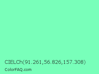 CIELCh 91.261,56.826,157.308 Color is a light green color and the nearest color is Aquamarine #7fffd4. Hex code #78ffba and RGB value is rgb(120,255,186). In RGB color space, this color is composed of 47% red, 100% green, 73% blue, In CMYK color space, this color is composed of 53% cyan, 0% magenta, 27% yellow , 0% black , In HSL color space, this color has a hue angle of 149° , 100% saturation and 74% lightness.