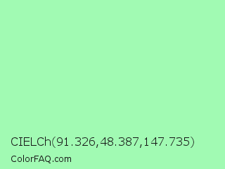 CIELCh 91.326,48.387,147.735 Color is a very light green color and the nearest color is Teal Deer #99e6b3. Hex code #a1fab3 and RGB value is rgb(161,250,179). In RGB color space, this color is composed of 63% red, 98% green, 70% blue, In CMYK color space, this color is composed of 36% cyan, 0% magenta, 28% yellow , 2% black , In HSL color space, this color has a hue angle of 132° , 90% saturation and 81% lightness.