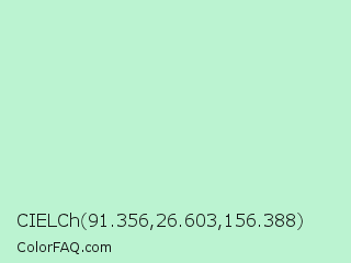 CIELCh 91.356,26.603,156.388 Color is a very light green color and the nearest color is Cruise #b5ecdf. Hex code #bbf3d1 and RGB value is rgb(187,243,209). In RGB color space, this color is composed of 73% red, 95% green, 82% blue, In CMYK color space, this color is composed of 23% cyan, 0% magenta, 14% yellow , 5% black , In HSL color space, this color has a hue angle of 144° , 70% saturation and 84% lightness.