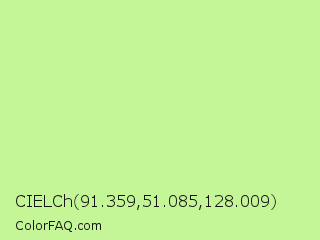 CIELCh 91.359,51.085,128.009 Color is a light green color and the nearest color is Reef #c9ffa2. Hex code #c4f597 and RGB value is rgb(196,245,151). In RGB color space, this color is composed of 77% red, 96% green, 59% blue, In CMYK color space, this color is composed of 20% cyan, 0% magenta, 38% yellow , 4% black , In HSL color space, this color has a hue angle of 91° , 82% saturation and 78% lightness.