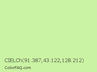 CIELCh 91.387,43.122,128.212 Color is a light green color and the nearest color is Reef #c9ffa2. Hex code #caf3a4 and RGB value is rgb(202,243,164). In RGB color space, this color is composed of 79% red, 95% green, 64% blue, In CMYK color space, this color is composed of 17% cyan, 0% magenta, 33% yellow , 5% black , In HSL color space, this color has a hue angle of 91° , 77% saturation and 80% lightness.