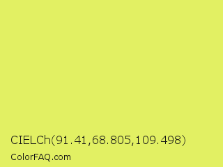 CIELCh 91.41,68.805,109.498 Color is a light yellow color and the nearest color is Booger Buster #dde26a. Hex code #e2f063 and RGB value is rgb(226,240,99). In RGB color space, this color is composed of 89% red, 94% green, 39% blue, In CMYK color space, this color is composed of 6% cyan, 0% magenta, 59% yellow , 6% black , In HSL color space, this color has a hue angle of 66° , 82% saturation and 66% lightness.