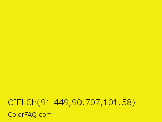 CIELCh 91.449,90.707,101.58 Color is a normal yellow color and the nearest color is Lemon #fde910. Hex code #f2ed0d and RGB value is rgb(242,237,13). In RGB color space, this color is composed of 95% red, 93% green, 5% blue, In CMYK color space, this color is composed of 0% cyan, 2% magenta, 95% yellow , 5% black , In HSL color space, this color has a hue angle of 59° , 90% saturation and 50% lightness.