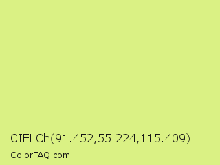 CIELCh 91.452,55.224,115.409 Color is a light lime color and the nearest color is Mindaro #e3f988. Hex code #daf184 and RGB value is rgb(218,241,132). In RGB color space, this color is composed of 85% red, 95% green, 52% blue, In CMYK color space, this color is composed of 10% cyan, 0% magenta, 45% yellow , 5% black , In HSL color space, this color has a hue angle of 73° , 80% saturation and 73% lightness.