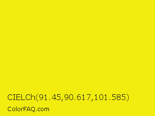 CIELCh 91.45,90.617,101.585 Color is a normal yellow color and the nearest color is Lemon #fde910. Hex code #f2ed0e and RGB value is rgb(242,237,14). In RGB color space, this color is composed of 95% red, 93% green, 5% blue, In CMYK color space, this color is composed of 0% cyan, 2% magenta, 94% yellow , 5% black , In HSL color space, this color has a hue angle of 59° , 90% saturation and 50% lightness.