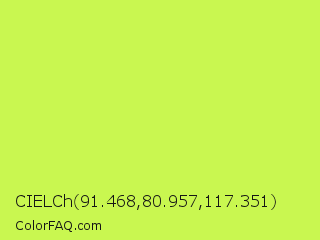 CIELCh 91.468,80.957,117.351 Color is a light lime color and the nearest color is Maximum Green Yellow #d9e650. Hex code #c9f750 and RGB value is rgb(201,247,80). In RGB color space, this color is composed of 79% red, 97% green, 31% blue, In CMYK color space, this color is composed of 19% cyan, 0% magenta, 68% yellow , 3% black , In HSL color space, this color has a hue angle of 77° , 91% saturation and 64% lightness.