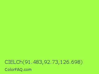 CIELCh 91.483,92.73,126.698 Color is a light green color and the nearest color is French Lime #9efd38. Hex code #a1ff47 and RGB value is rgb(161,255,71). In RGB color space, this color is composed of 63% red, 100% green, 28% blue, In CMYK color space, this color is composed of 37% cyan, 0% magenta, 72% yellow , 0% black , In HSL color space, this color has a hue angle of 91° , 100% saturation and 64% lightness.