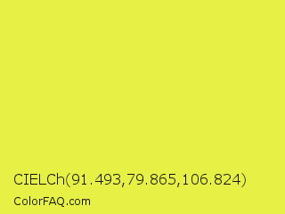 CIELCh 91.493,79.865,106.824 Color is a light yellow color and the nearest color is Starship #ecf245. Hex code #e6f045 and RGB value is rgb(230,240,69). In RGB color space, this color is composed of 90% red, 94% green, 27% blue, In CMYK color space, this color is composed of 4% cyan, 0% magenta, 71% yellow , 6% black , In HSL color space, this color has a hue angle of 64° , 85% saturation and 61% lightness.