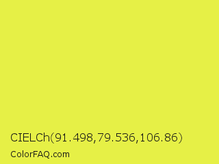 CIELCh 91.498,79.536,106.86 Color is a light yellow color and the nearest color is Starship #ecf245. Hex code #e6f046 and RGB value is rgb(230,240,70). In RGB color space, this color is composed of 90% red, 94% green, 27% blue, In CMYK color space, this color is composed of 4% cyan, 0% magenta, 71% yellow , 6% black , In HSL color space, this color has a hue angle of 64° , 85% saturation and 61% lightness.