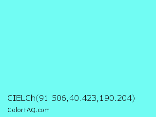 CIELCh 91.506,40.423,190.204 Color is a light cyan color and the nearest color is Electric Blue #7df9ff. Hex code #71fcf3 and RGB value is rgb(113,252,243). In RGB color space, this color is composed of 44% red, 99% green, 95% blue, In CMYK color space, this color is composed of 55% cyan, 0% magenta, 4% yellow , 1% black , In HSL color space, this color has a hue angle of 176° , 96% saturation and 72% lightness.