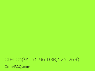 CIELCh 91.51,96.038,125.263 Color is a light green color and the nearest color is French Lime #9efd38. Hex code #a3ff3a and RGB value is rgb(163,255,58). In RGB color space, this color is composed of 64% red, 100% green, 23% blue, In CMYK color space, this color is composed of 36% cyan, 0% magenta, 77% yellow , 0% black , In HSL color space, this color has a hue angle of 88° , 100% saturation and 61% lightness.