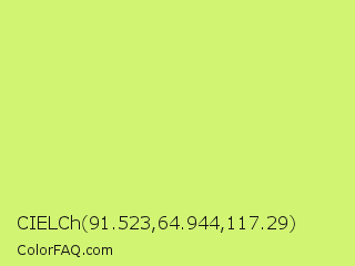 CIELCh 91.523,64.944,117.29 Color is a light lime color and the nearest color is Sulu #c1f07c. Hex code #d2f473 and RGB value is rgb(210,244,115). In RGB color space, this color is composed of 82% red, 96% green, 45% blue, In CMYK color space, this color is composed of 14% cyan, 0% magenta, 53% yellow , 4% black , In HSL color space, this color has a hue angle of 76° , 85% saturation and 70% lightness.