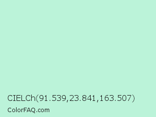 CIELCh 91.539,23.841,163.507 Color is a very light green color and the nearest color is Cruise #b5ecdf. Hex code #bbf3d9 and RGB value is rgb(187,243,217). In RGB color space, this color is composed of 73% red, 95% green, 85% blue, In CMYK color space, this color is composed of 23% cyan, 0% magenta, 11% yellow , 5% black , In HSL color space, this color has a hue angle of 152° , 70% saturation and 84% lightness.