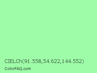 CIELCh 91.558,54.622,144.552 Color is a light green color and the nearest color is Pale Green #98fb98. Hex code #9efca8 and RGB value is rgb(158,252,168). In RGB color space, this color is composed of 62% red, 99% green, 66% blue, In CMYK color space, this color is composed of 37% cyan, 0% magenta, 33% yellow , 1% black , In HSL color space, this color has a hue angle of 126° , 94% saturation and 80% lightness.