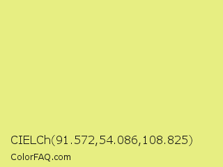 CIELCh 91.572,54.086,108.825 Color is a light yellow color and the nearest color is Key Lime #e8f48c. Hex code #e7ee82 and RGB value is rgb(231,238,130). In RGB color space, this color is composed of 91% red, 93% green, 51% blue, In CMYK color space, this color is composed of 3% cyan, 0% magenta, 45% yellow , 7% black , In HSL color space, this color has a hue angle of 64° , 76% saturation and 72% lightness.