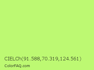 CIELCh 91.588,70.319,124.561 Color is a light green color and the nearest color is Sulu #c1f07c. Hex code #bdf972 and RGB value is rgb(189,249,114). In RGB color space, this color is composed of 74% red, 98% green, 45% blue, In CMYK color space, this color is composed of 24% cyan, 0% magenta, 54% yellow , 2% black , In HSL color space, this color has a hue angle of 87° , 92% saturation and 71% lightness.