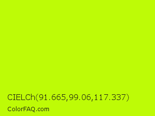 CIELCh 91.665,99.06,117.337 Color is a normal lime color and the nearest color is Lime #bfff00. Hex code #befb06 and RGB value is rgb(190,251,6). In RGB color space, this color is composed of 75% red, 98% green, 2% blue, In CMYK color space, this color is composed of 24% cyan, 0% magenta, 98% yellow , 2% black , In HSL color space, this color has a hue angle of 75° , 97% saturation and 50% lightness.