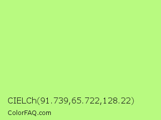 CIELCh 91.739,65.722,128.22 Color is a light green color and the nearest color is Sulu #c1f07c. Hex code #b8fa80 and RGB value is rgb(184,250,128). In RGB color space, this color is composed of 72% red, 98% green, 50% blue, In CMYK color space, this color is composed of 26% cyan, 0% magenta, 49% yellow , 2% black , In HSL color space, this color has a hue angle of 92° , 92% saturation and 74% lightness.