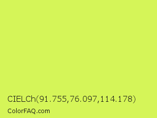 CIELCh 91.755,76.097,114.178 Color is a light lime color and the nearest color is Maximum Green Yellow #d9e650. Hex code #d5f558 and RGB value is rgb(213,245,88). In RGB color space, this color is composed of 84% red, 96% green, 35% blue, In CMYK color space, this color is composed of 13% cyan, 0% magenta, 64% yellow , 4% black , In HSL color space, this color has a hue angle of 72° , 89% saturation and 65% lightness.